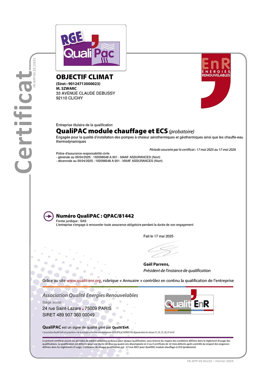 Pour bénéficier des principales aides financières de l’État (MaPrimeRénov’, Prime CEE, éco-PTZ), il est obligatoire de faire appel à une entreprise qualifiée RGE (Reconnu Garant de l’Environnement). Objectif Climat est certifié pour les travaux suivants :